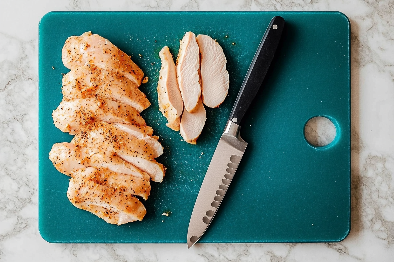 Start by trimming the chicken breasts into even pieces, about 1-inch thick. You can also lightly pound the chicken breasts to ensure even cooking.