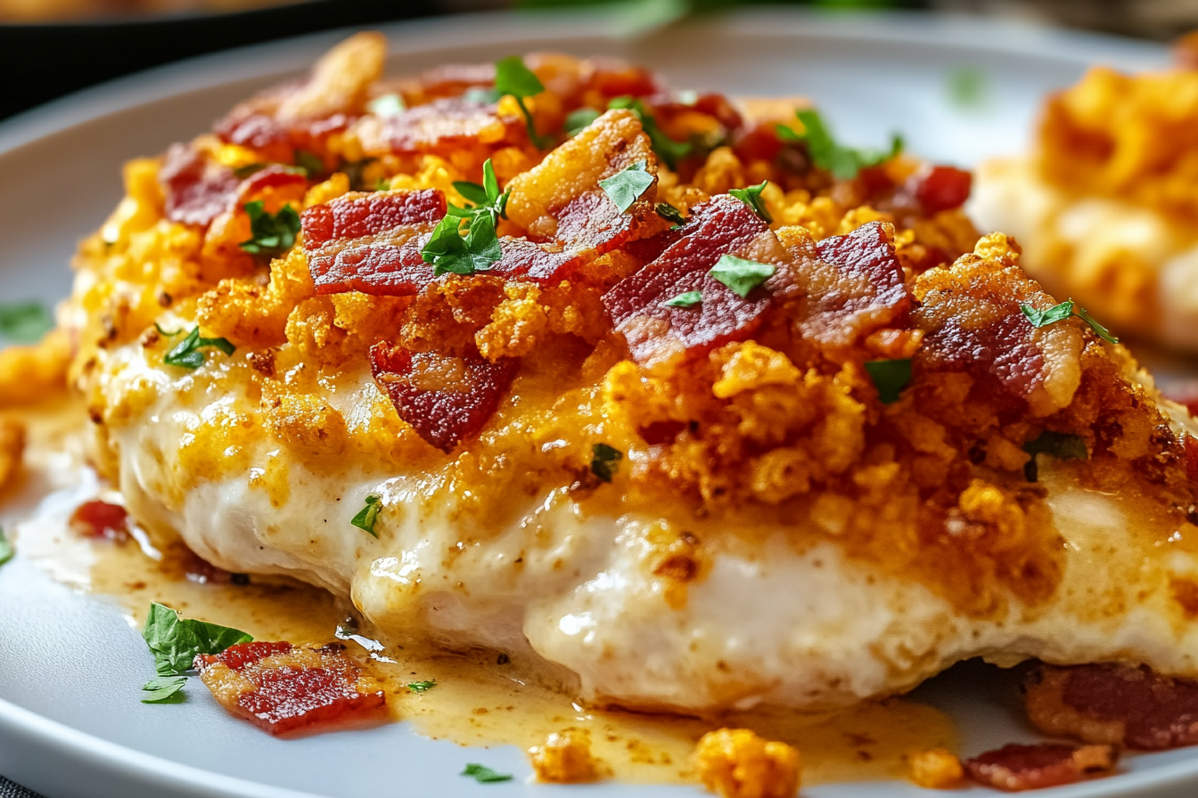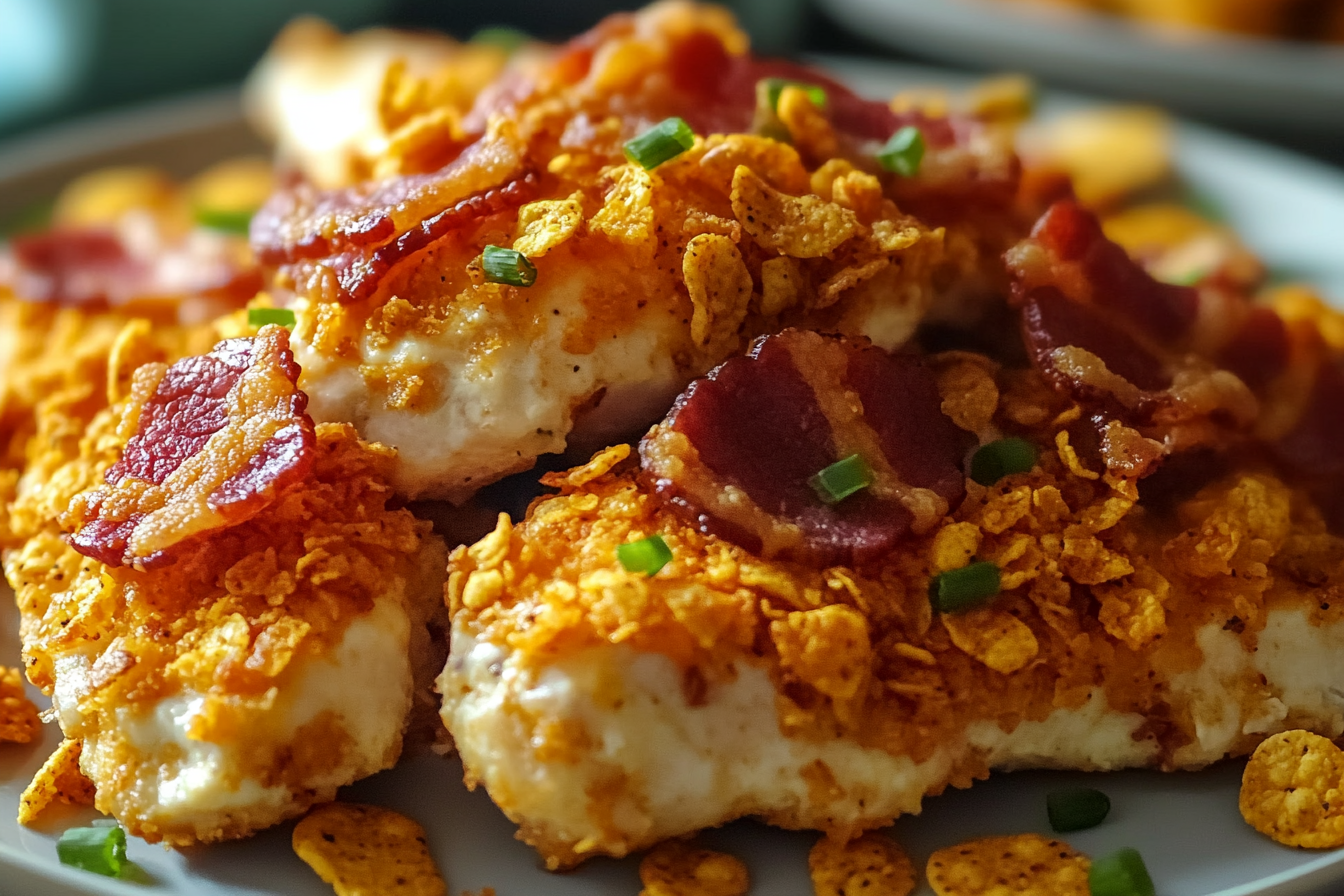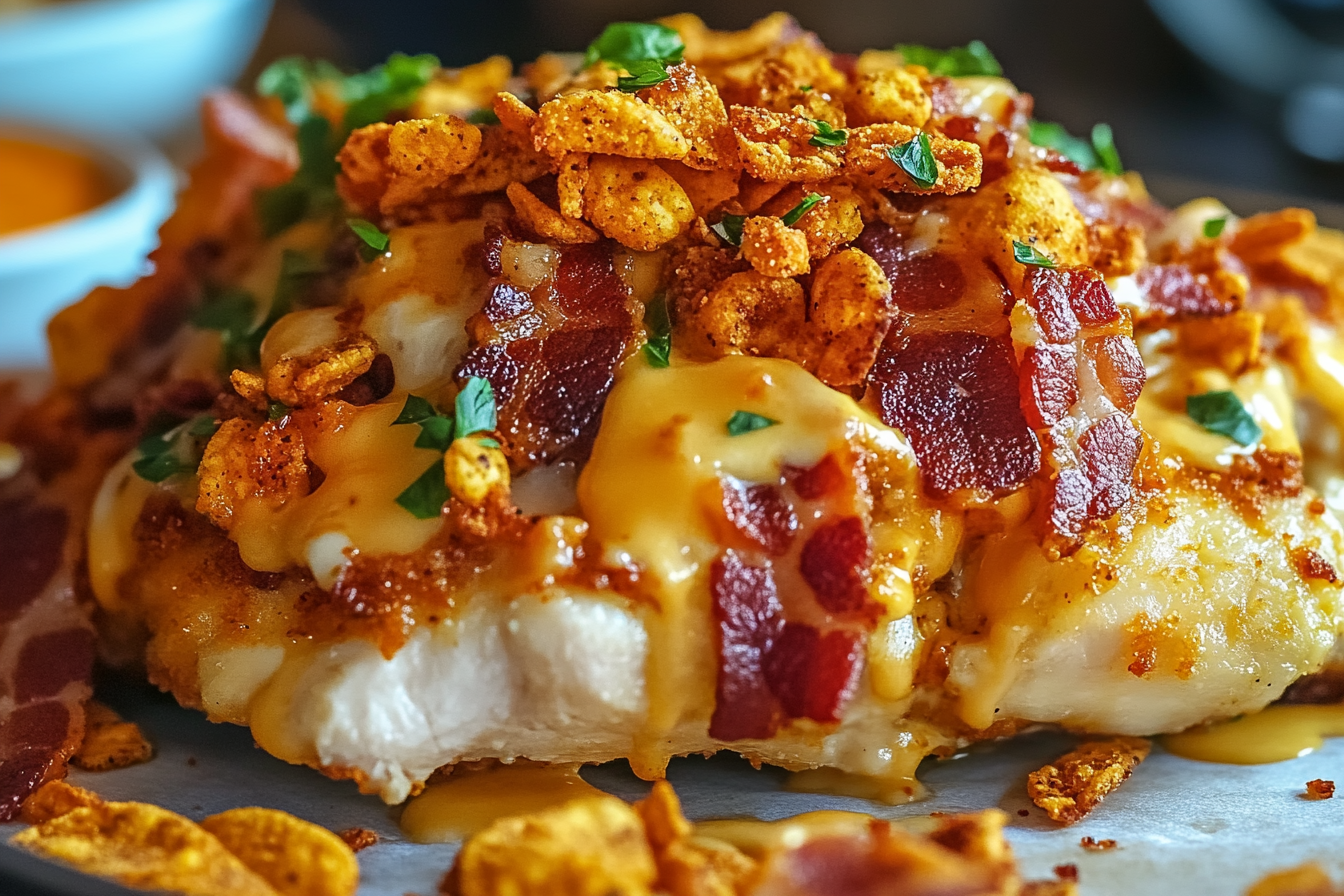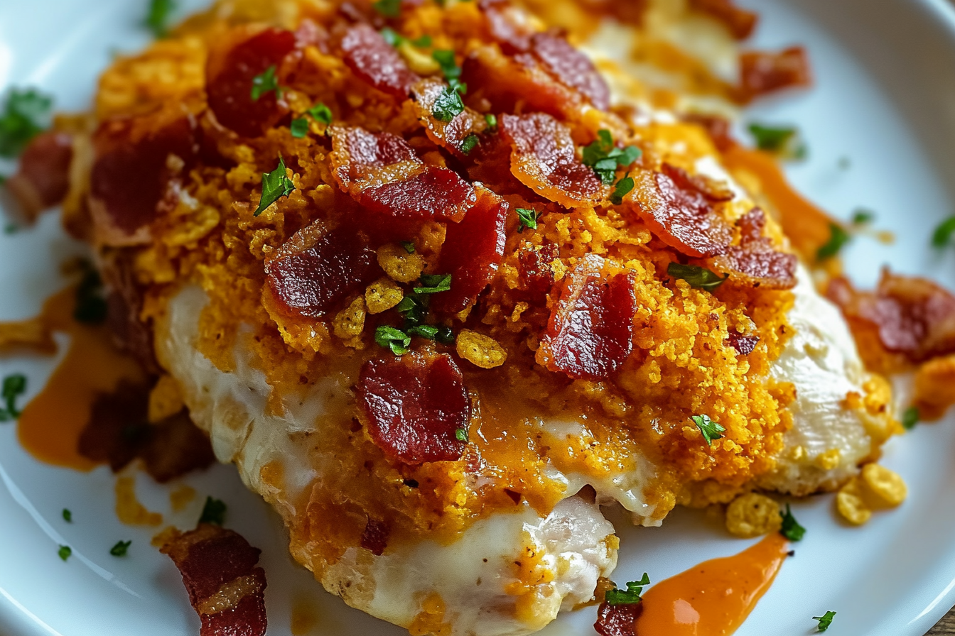 A deliciously indulgent dish featuring tender chicken breasts stuffed with creamy cheese and bacon, coated with crunchy Doritos for a bold and satisfying flavor.