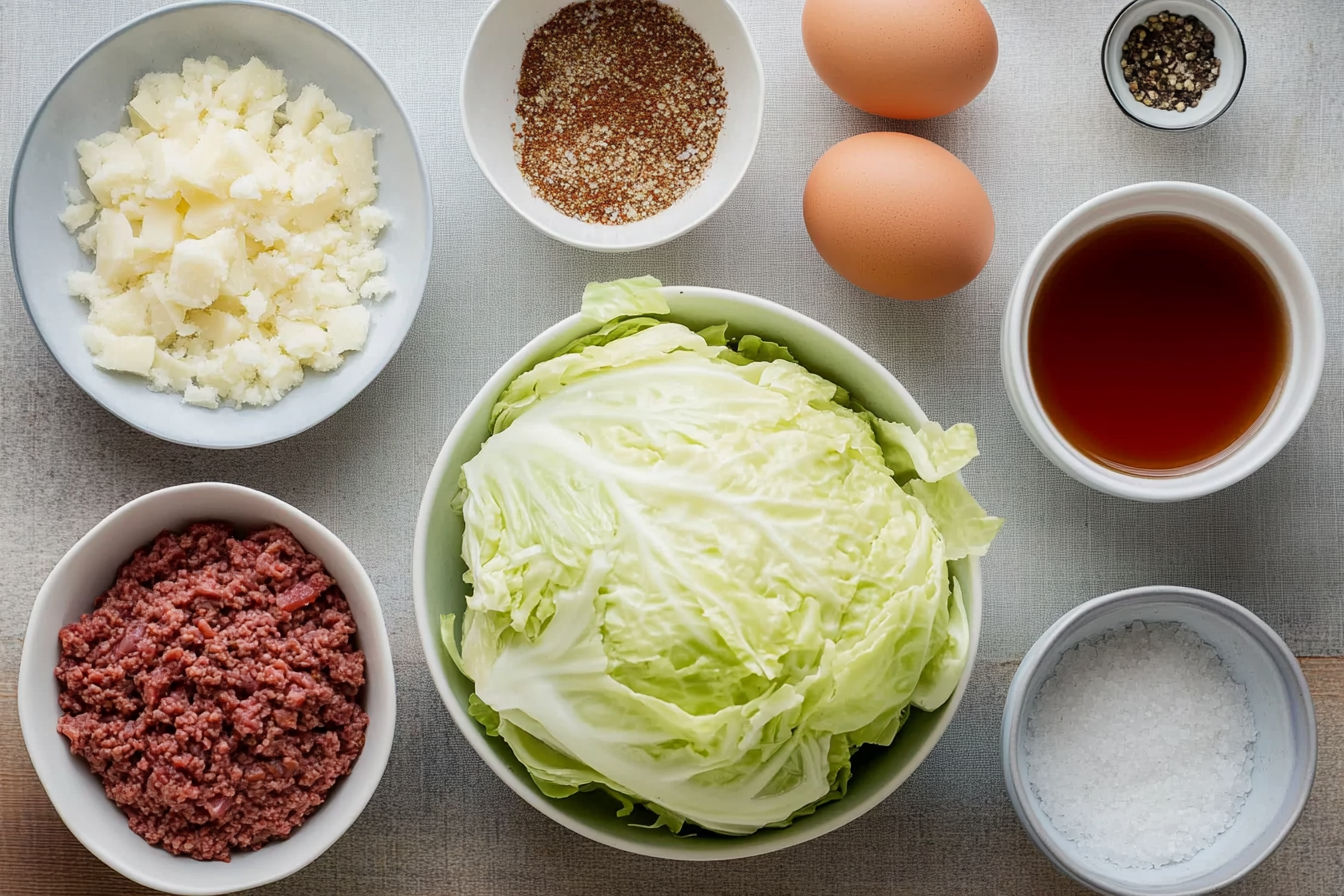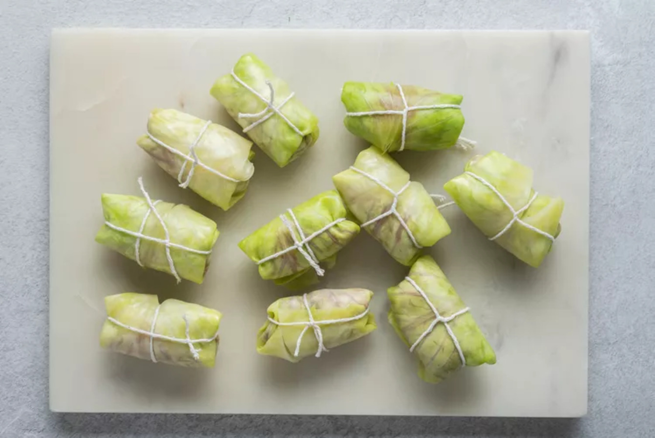 Gently peel the cabbage leaves off the head. Lay them flat on a clean surface and trim the tough vein from the center of each leaf. Place a spoonful of the beef filling in the center of each leaf, fold in the sides, and roll tightly to form a cylinder. Secure each roll by tying them with kitchen twine or placing a toothpick through the center.