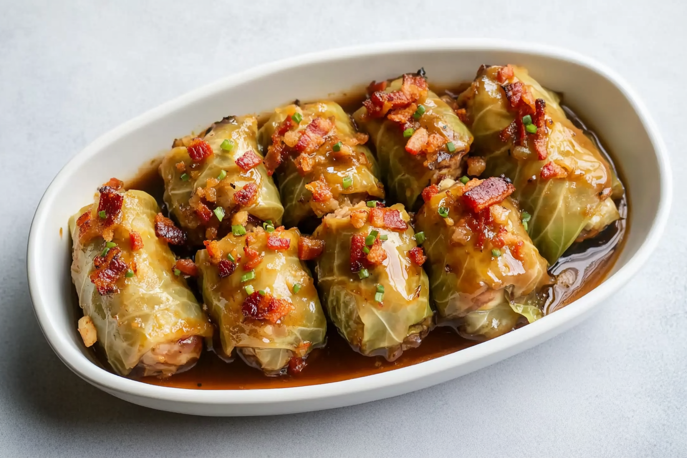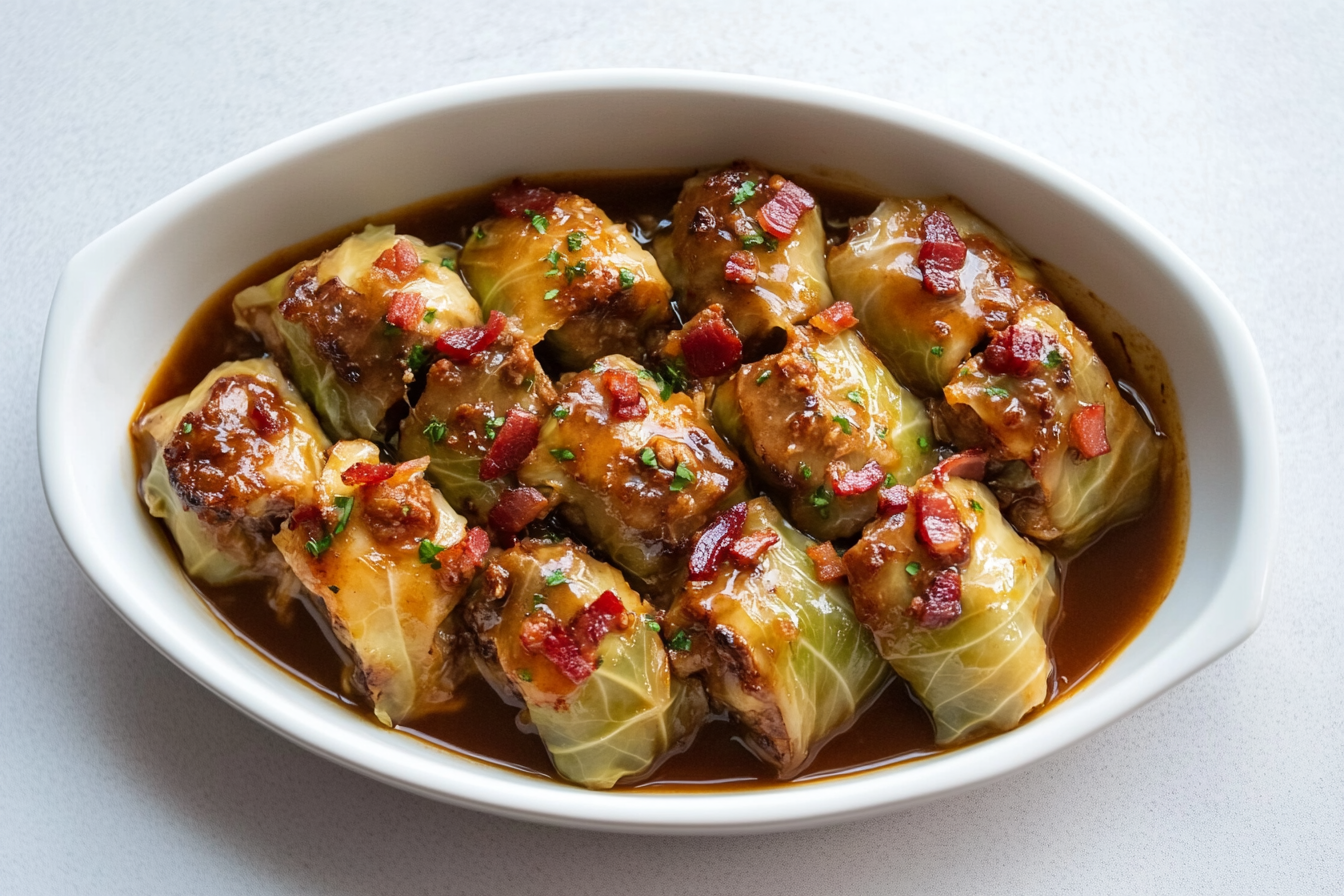 Serve the cabbage rolls with the sauce spooned over the top. Garnish with crumbled bacon if desired. Enjoy with mashed potatoes or crusty bread for a complete meal.